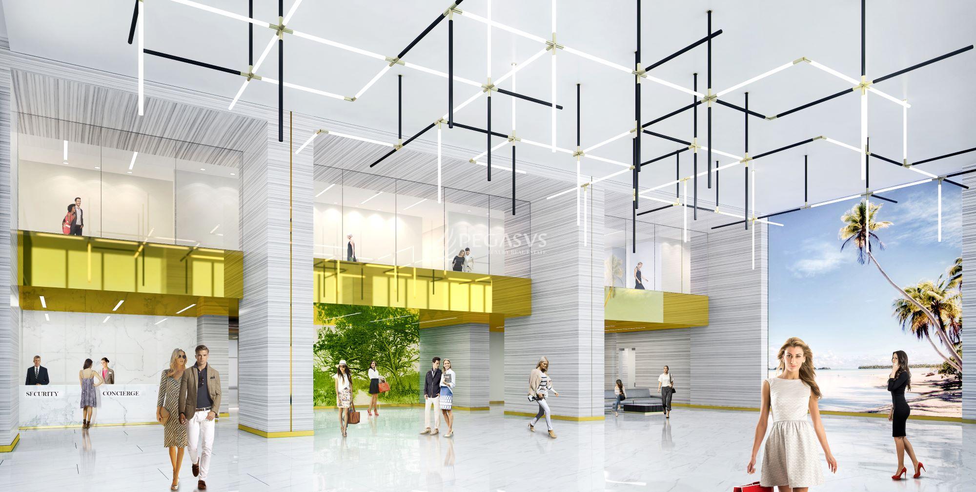 Panorama residents are greeted by a private arrival court, porte-cochère entry, and a two-story lobby featuring concierge service, as well as 24/7 reception, security, and valet parking. The grand lobby also includes an ever-changing, 45-foot, multimedia wall display and an extraordinary overhead light sculpture.